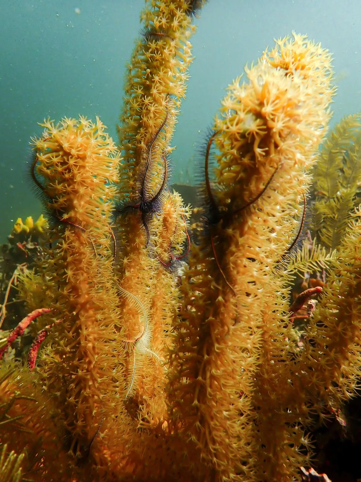 Estas esponjas son hábitats vitales para varias especies marinas: a menudo encontrarás pequeños camarones limpiadores, cangrejos y peces buscando refugio entre los rincones y grietas de estas esponjas, destacando las intrincadas relaciones que prosperan en este reino submarino.